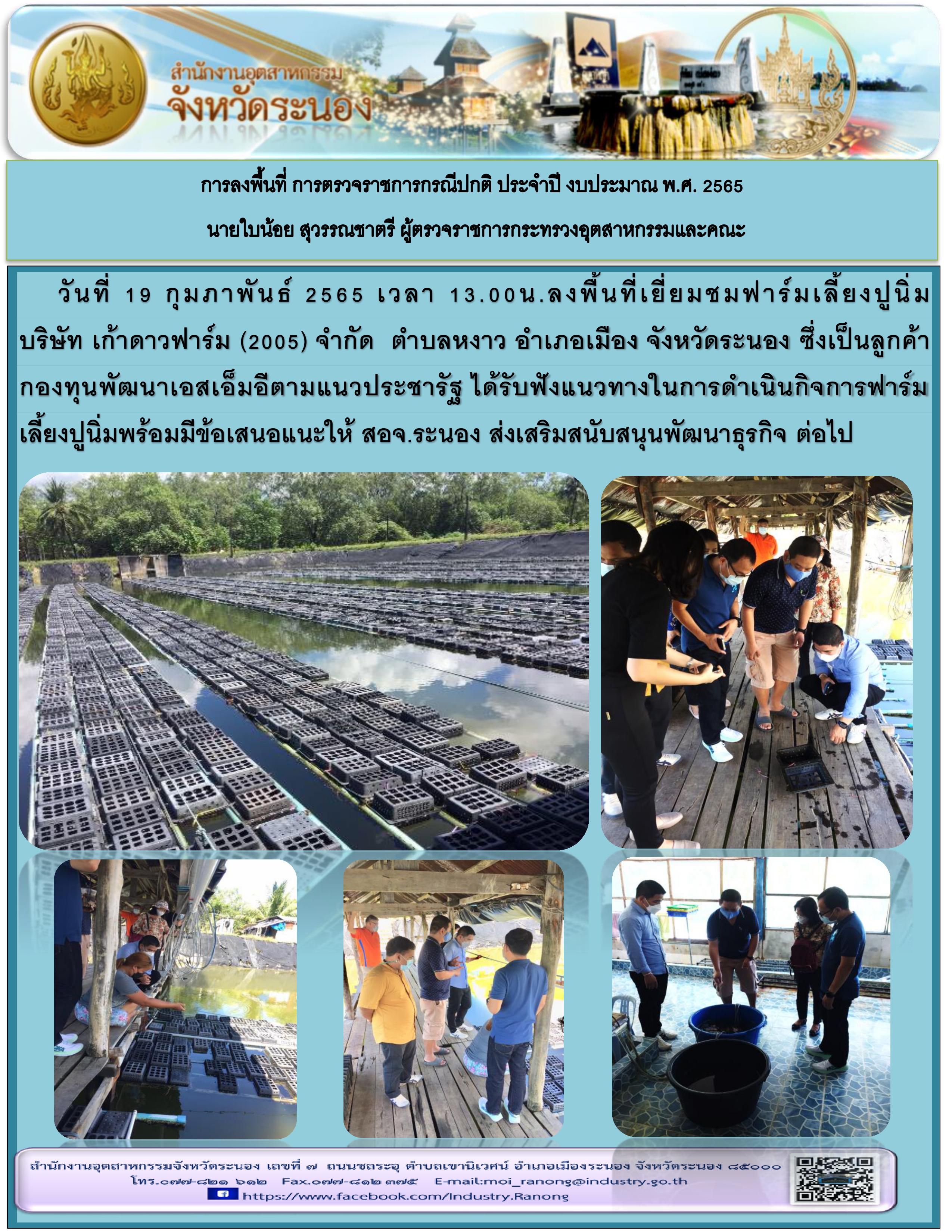 วันที่ 19 กุมภาพันธ์ 2565 เวลา 09.30 น. นายใบน้อย สุวรรณชาตรี ผู้ตรวจราชการกระทรวงอุตสาหกรรม และคณะ พร้อมด้วยนายวิเชียร ทองด้วง อุตสาหกรรมจังหวัดระนอง และเจ้าหน้าที่สำนักงานอุตสาหกรรมจังหวัดระนอง ลงพื้นที่หมู่บ้านหาดส้มแป้น ซึ่งเป็นหมู่บ้านอุตสาหกรรมสร้างสรรค์ (Creative Industry Village:CIV) โดยนั่งรถสองแถวไม้ไปตามเส้นทางท่องเที่ยวของหมู่บ้าน CIV เยี่ยมชมวิถีชีวิตชาวบ้านการร่อนแร่ และเยี่ยมชมศูนย์เซรามิกหาดส้มแป้น โดยมีนางสาวสุรีย์พร สรรพกุล รองประธานกลุ่มเซรามิกบ้านหาดส้มแป้น , รองนายก อบต.หาดส้มแป้น , กำนันตำบลหาดส้มแป้น และอาจารย์จากมหาวิทยาลัยราชภัฎสวนสุนันทา ให้การต้อนรับ เวลา 13.00น. ลงพื้นที่เยี่ยมชมฟาร์มเลี้ยงปูนิ่ม บริษัท เก้าดาวฟาร์ม (2005) จำกัด ตำบลหงาว อำเภอเมือง จังหวัดระนอง ซึ่งเป็นลูกค้ากองทุนพัฒนาเอสเอ็มอีตามแนวประชารัฐ ได้รับฟังแนวทางในการดำเนินกิจการฟาร์มเลี้ยงปูนิ่มพร้อมมีข้อเสนอแนะให้ สอจ.ระนอง ส่งเสริมสนับสนุนพัฒนาธุรกิจ ต่อไป
